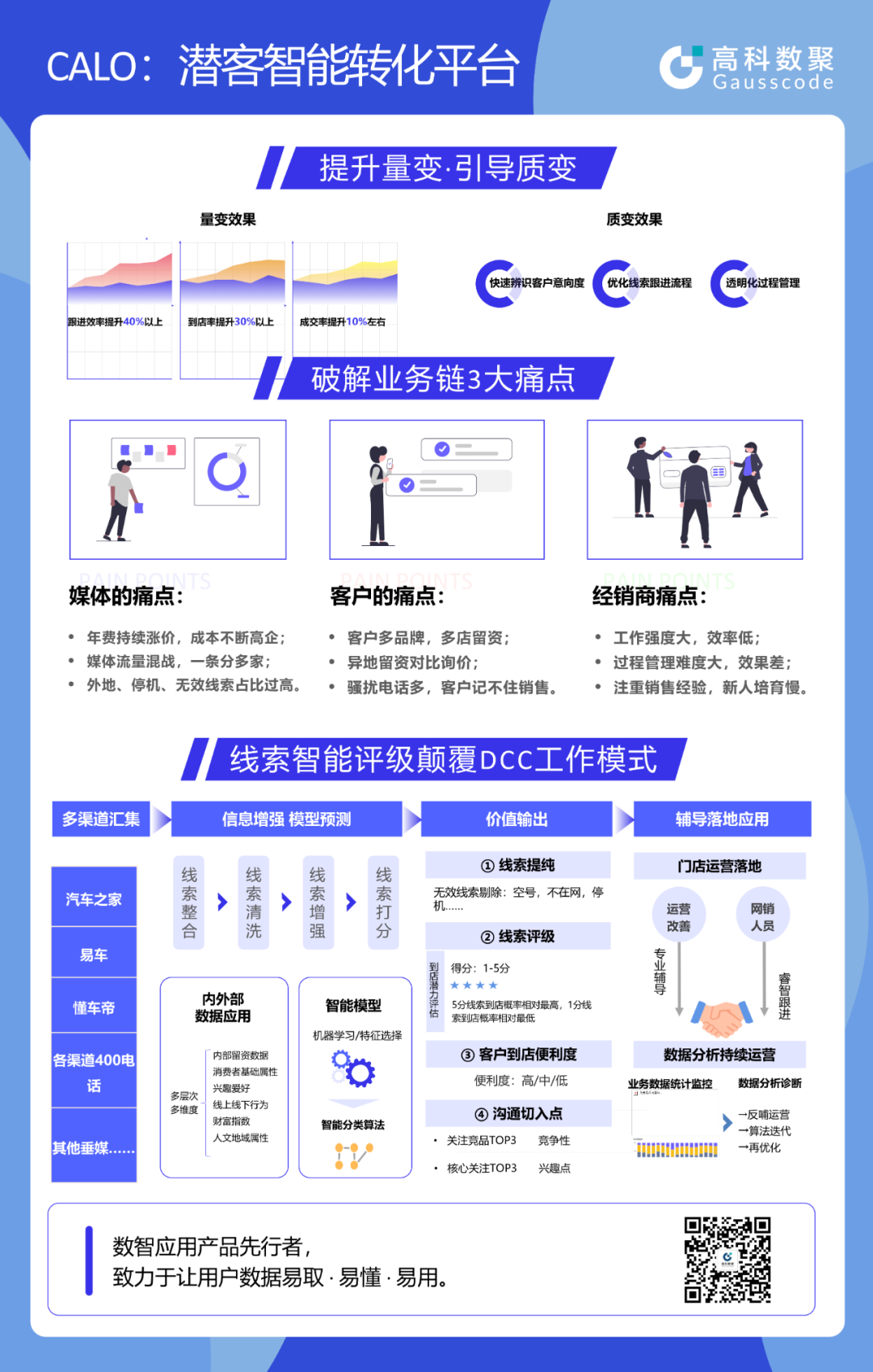 CALO围绕DCC一线工作流程,将“数据运营”落地在经销商实战工作中,首呼邀约、线索跟进、线索等级判断、战败线索管理和挽回、销售趋势预警等 高效且有保障的经销商智能运营方案,切实的帮助店端解决线索无效、线索购买贵、线索转化效率低等难题。为DCC给予“智慧大脑”,有效提升到店邀约。